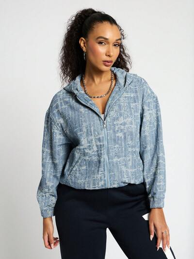 SUMWON WOMEN Veste en jean bombardier à capuche de créateur, vêtement urbain de tous les temps avec fermeture éclair, poches. Mode décontractée moderne pour le printemps, l'automne et l'hiver