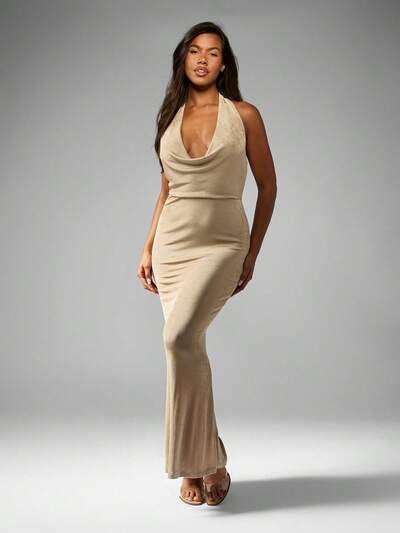 MISSGUIDED Robe longue texturée en satin à col croisé, taille découpée, dos nu et ourlet évasé