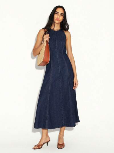 KSTM Robe mi-longue en jean pour femmes avec décolleté ras-du-cou sans manches, coupe évasée et design dos nageur, pour occasions décontractées au printemps et en été
