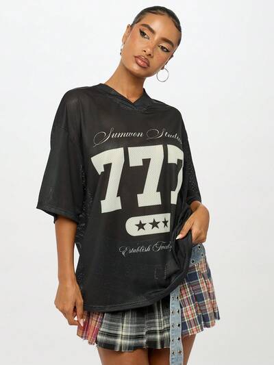 SUMWON WOMEN Tee-shirt de jersey de sport surdimensionné en maille noire avec impression de numéro de sport. Style de rue, coupe longue, Top de sport urbain pour l'automne