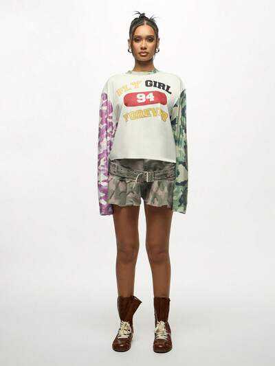SUMWON WOMEN 94 Forever Girl Sweat-shirt-shirt oversize à manches longues, design de manches bicolores camouflage, streetwear décontracté pour l'automne et l'hiver, Top graphique-50%