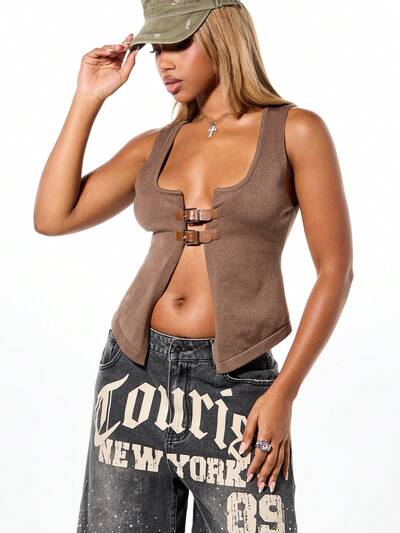 SUMWON WOMEN Canotta asimmetrica con dettaglio fibbia a maglia a costine, cardigan senza maniche con apertura frontale