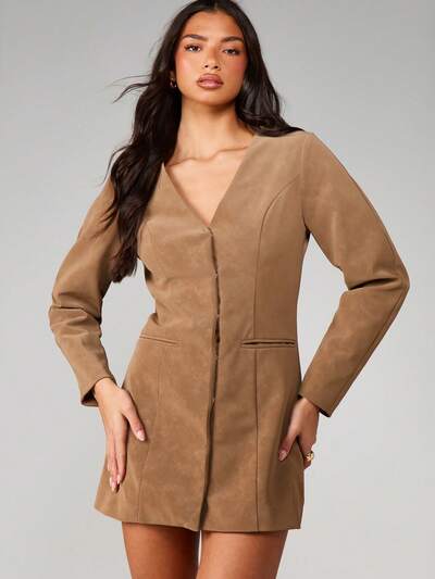 MISSGUIDED Mini abito in pelle scamosciata con scollo a V e maniche a palloncino