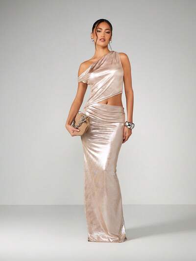 MISSGUIDED Abito lungo metallizzato monospalla