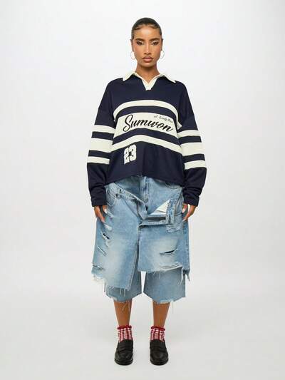 SUMWON WOMEN Polo rugby oversize a maniche lunghe con stampa a righe bianche atletiche e colletto classico a contrasto, capo essenziale per lo streetwear autunno/inverno-40%