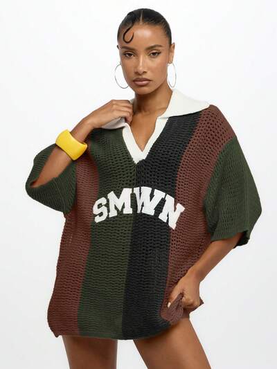 SUMWON WOMEN Maglione oversize con logo SMWN a maglia larga e morbida, collo tipo polo, stile pullover campus, per autunno e inverno, felpa sportiva casual da college-55%