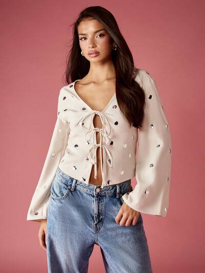 MISSGUIDED Camicetta borchiata con nodo sul davanti e maniche a sbuffo
