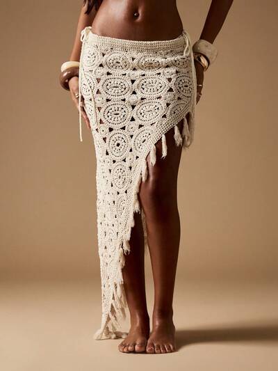 KIZN Minigonna in pizzo raffinata con applicazioni a conchiglia, coprispalle per festival estivi e spiaggia, design in maglia, abbigliamento per spiaggia, resort, feste e serate in riva al mare
