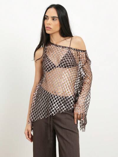 KSTM Top asimmetrico da donna con una spalla, in rete con paillettes, con motivo a griglia di diamanti metallici e maniche drappeggiata, adatto per feste e eventiCodice: SAVE25