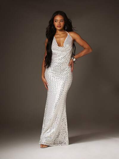 MISSGUIDED Abito lungo a sirena con paillettes e scollo profondo all'americana.