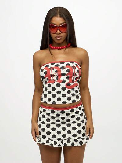 SUMWON WOMEN Set coordinato mini a pois, top corto e minigonna, stile estivo festival Y2K, con volant sul fondo, senza spalline, per feste e discoteca