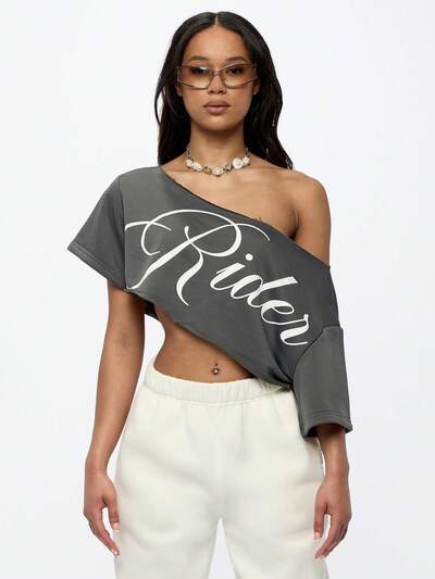 SUMWON WOMEN T-shirt crop top con stampa grafica da motociclista, scollo alla spalla, per l′estate, festival, concerti e feste, abbigliamento casual da strada, design moderno e confortevole-15%
