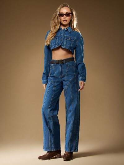 MISSGUIDED Giacca in denim corta con jeans a gamba larga