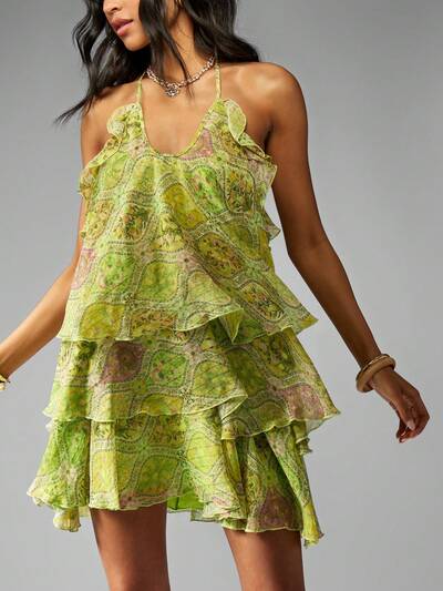 MISSGUIDED Miniabito a balze con scollo all'americana e stampa paisley in chiffon fluido
