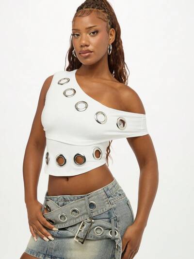 SUMWON WOMEN Top corto asimmetrico con una spalla, con dettagli in occhielli, adatto per festival, feste, uscite serali, stile di strada, moda estiva, stile moderno
