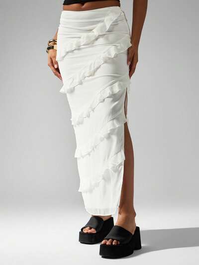 MISSGUIDED Gonna midi elegante e moderna con volant a strati e spacchi laterali-50%