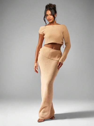 KIZN Set coordinato maglia a coste scollo spalla, gonna lunga a vita alta, abbigliamento da relax invernale/autunnale, maniche lunghe, elegante per occasioni serali e feste