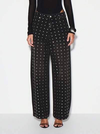 KIZN Jeans a vita alta con gamba ampia, con borchie, per festival e concerti, denim di con borchie metalliche su tutto il motivo
