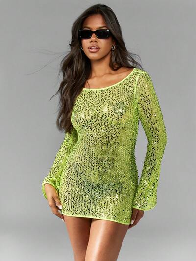 MISSGUIDED Mini abito aderente a maniche lunghe con paillettes, schiena scoperta, glitter scintillanti, Natale