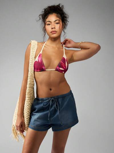 SUMWON WOMEN Minishorts in jeans verniciato a vita ultra alta con dettaglio di laccetti anteriori, stile festival alla moda Y2K, pantaloncini estivi attillati e stretchy