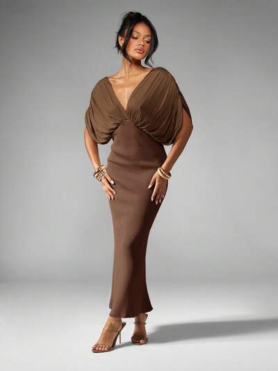 MISSGUIDED Abito lungo con maniche dolman drappeggiate e scollatura profonda