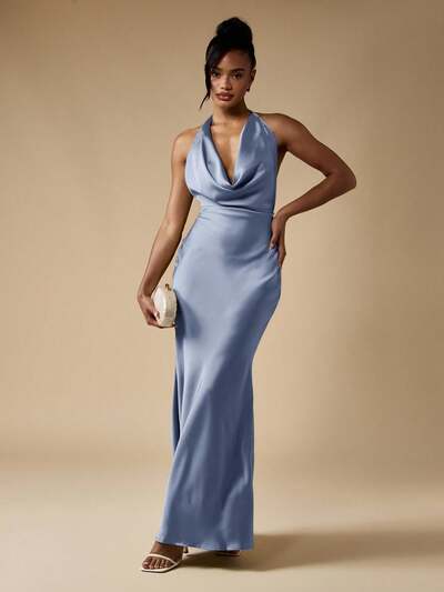 MISSGUIDED Abito lungo in raso con scollo a cappuccio e schiena drappeggiata