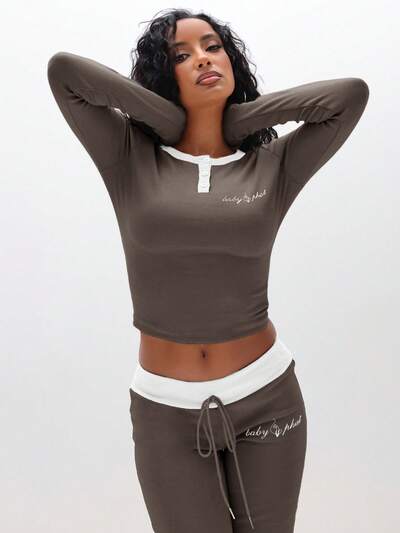 BABYPHAT Maglia a maniche lunghe con scollo a V e bottoni, con bordi in contrasto rosa, dettaglio di stampa con testo in corsivo, casual e aderente