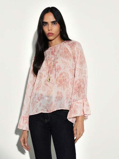 KSTM Camicetta da donna con stampa floreale, maniche a campana con volant, collo tondo, parte superiore plissettata raccolta, in chiffon, casual, primavera/estate, moda