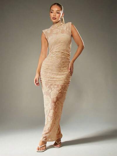 MISSGUIDED Abito lungo con scollo alto e ricami floreali in rete