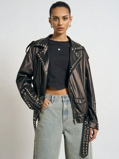 AiiRZ オーバーサイズ フェイクレザー モーターサイクルジャケット 非対称ジップクロージャー ラペルカラー 秋冬アウター-50%