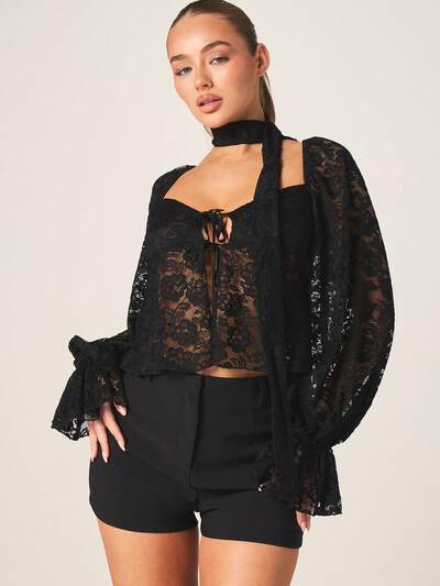 MISSGUIDED タイネックのレースベルスリーブブラウス-25%