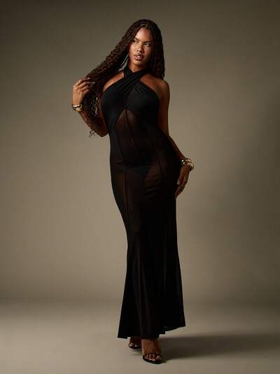 MISSGUIDED ホルターネック メッシュパネル マキシドレス サイドスリット-45%