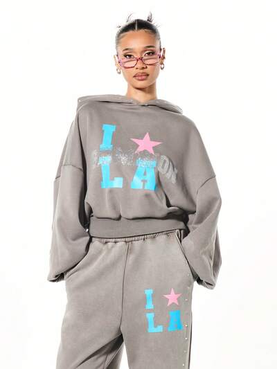 SUMWON WOMEN ラインストーン付きパーカー LA スター プリント グラフィック ルーズフィット カジュアル プルオーバー スウェットシャツ オーバーサイズ ウォッシュ加工 パーカー-50%