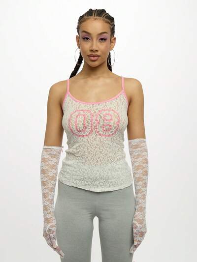SUMWON WOMEN 繊細なレースキャミソールタンクトップ、Y2Kインスパイアのコントラストバインディング、レトログラフィックプリント、オペラ丈グローブ、フェスティバル コンサート パーティーウェア 夏春-50%