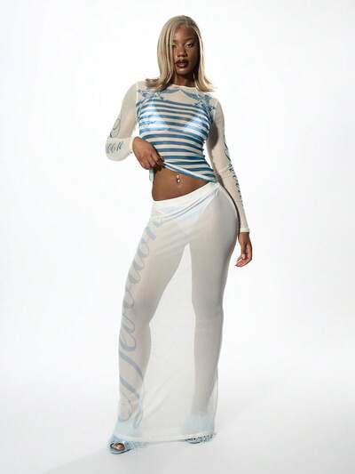 SUMWON WOMEN プレミアムスクリプトプリントメッシュマキシ丈フロアレングスフェスティバルシアービーチリゾートイブニングパーティースカート、透明なオーバーレイ、フォーマル、エレガントなボトムス-40%