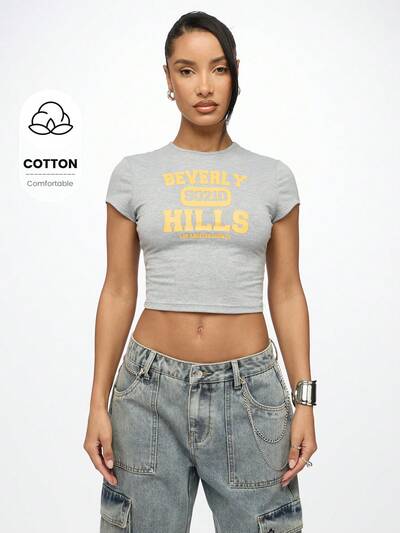 SUMWON WOMEN ビバリーヒルズ90210レトロストリートウェアクロップトップベビーTシャツY2KファッションロサンゼルスカウンティステートメントフィッテッドショートスリーブサマーカジュアルTシャツ-40%