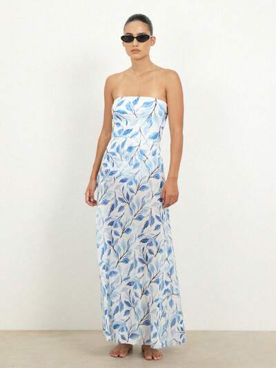 KSTM レディース ブルー リーフプリント Aラインロングマキシスカート バックカットアウト サイドスリット付き-35%