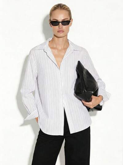 KSTM レディース オーバーサイズ ピンストライプ ボタンダウンブラウス 長袖 オフィス プロフェッショナル シャツ クラシックカラー ワークトップコード: PAYDAY20