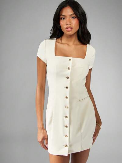 MISSGUIDED スクエアネック、ボタンフロント、キャップスリーブのミニドレス-50%