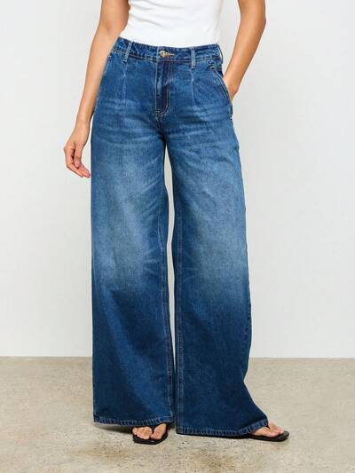 AiiRZ ウルトラワイドレッグデニムジーンズパレッツォスタイルリラックスフィット ハイウエスト レトロY2KファッションステートメントパンツSUMWON WOMEN オーバーサイズ ウォッシュ加工 ストライプデニムシャツ