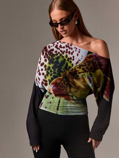 AiiRZ 非対称オフショルダーブラウス、フローラルパターンデザイン、長袖、イブニングパーティー、冬秋ファッション、ウエストのギャザー付き、ステートメントトップ-5%