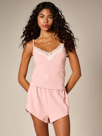 AiiRZ 夏用 ノースリーブ レギュラートップ とルーズフィットショーツ レース付きリブパジャマセット新しい