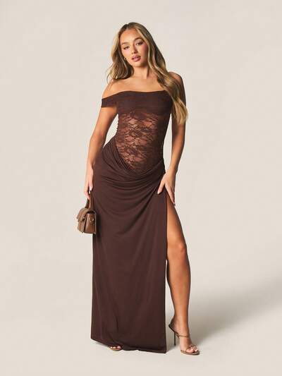 MISSGUIDED オフショルダー レースボディス マキシドレス サイドスリット-10%