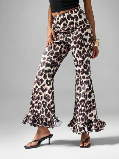MISSGUIDED 러플 밑단 디테일이 돋보이는 레오파드 프린트 플레어 팬츠-45%