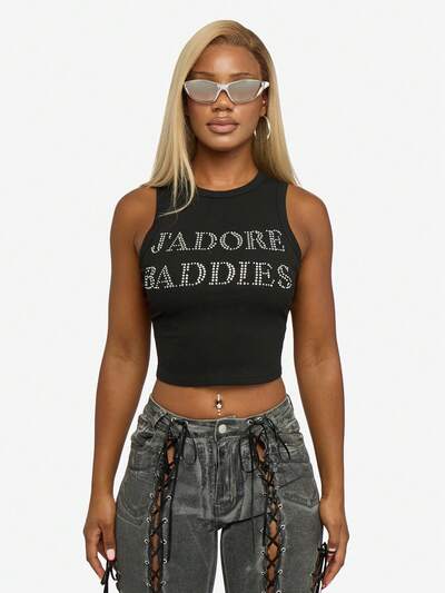 SUMWON WOMEN 민소매 탱크 톱 노치넥 코튼 블렌드 섬머 페스티벌 청년 스타일 크롭 텍스트 디테일 슬림 핏 패션 캐주얼 클럽 스트리트웨어 댄스 파티