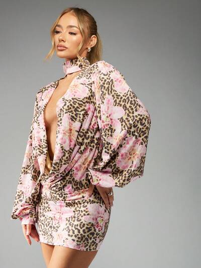 MISSGUIDED 레오파드 플로럴 프린트 퍼프 슬리브 카울넥 미니 드레스-50%