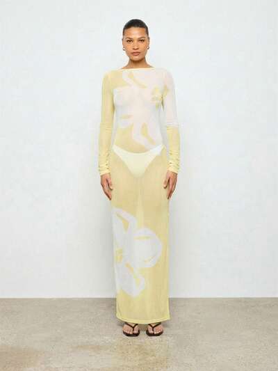 AiiRZ 오픈 백 디테일과 옆트임이 있는 부드러운 파스텔 메시 롱 슬리브 바디콘 맥시 드레스-30%