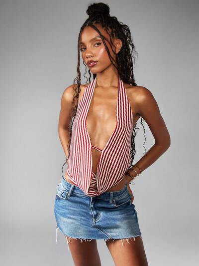MISSGUIDED 홀터넥 스트라이프 반도 타이백 크롭 탑 크리스마스-35%