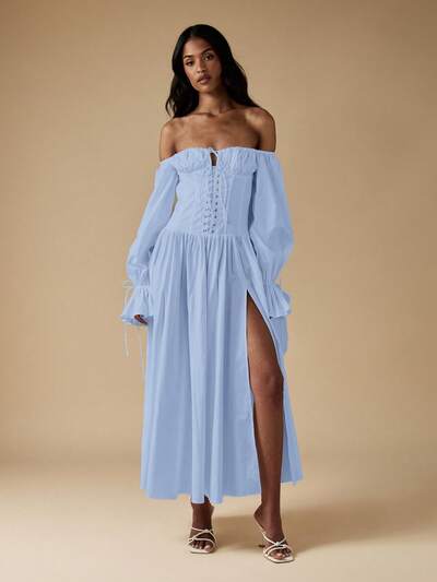 MISSGUIDED 벌룬 슬리브와 스플릿 디자인의 오프숄더 코르셋 드레스-50%