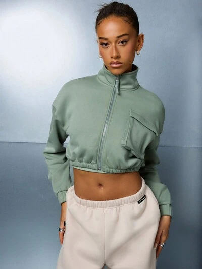 SUMWON WOMEN 카고 포켓이 있는 크롭트 유틸리티 스웨트셔츠 풀 집업 모크 넥 운동복 루즈웨어 가을 겨울 스포티 스트릿웨어-40%